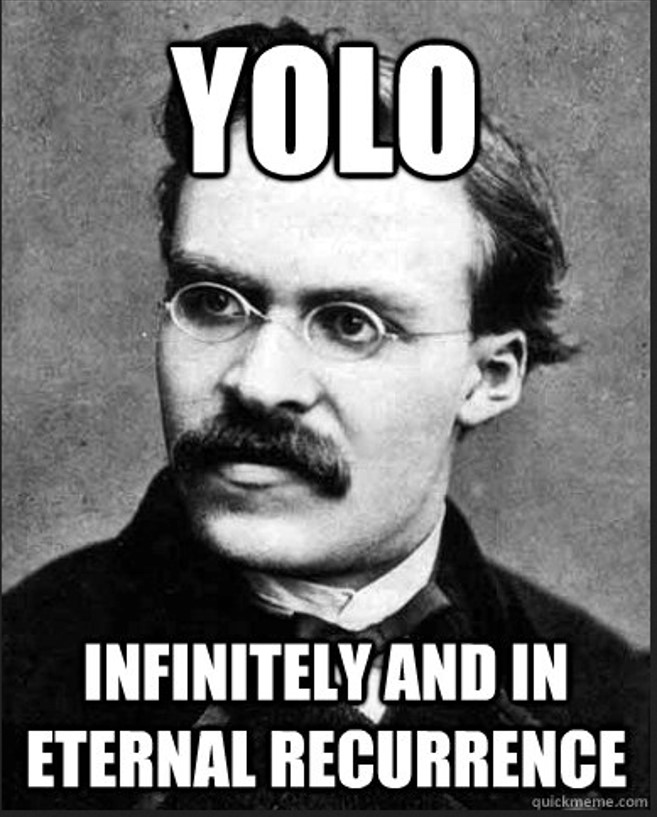 One of Nietzsche’s most popular ideas is that of the Superman- who by pushing all the nons and the nos aside, becomes one with the life force-a force of creativity that exceeds Man. This theory of the Superman is also linked to the Theory of Eternal Return– where everything in the Universe is bound to repeat itself in a self-similar form for an infinite number of times across infinite time or space. While for Man, this is the ultimate horror, for the Superman, the wish for the eternal return of all events would mark the ultimate affirmation of life. The universe is recurring over infinite time and space, but the different versions of events that have occurred in the past may at one point or another take place again, hence “all configurations that have previously existed on this earth must yet meet”. And with each version of events is hoping that some knowledge or awareness is gained to better the individual, hence says Nietzsche “And thus it will happen one day that a man will be born again, just like me and a woman will be born, just like Mary—only that it is hoped to be that the head of this man may contain a little less foolishness.””