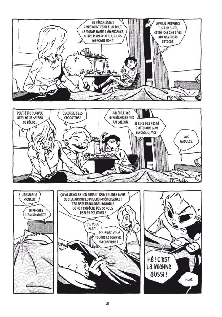 This unique series by Rémi Gourrierec, features quite ordinary children who discover that their father is a superhero: when the latter disappears, they decide to take over his role. However, once they get over the enthusiasm of the beginning, they realize that being a super hero requires many sacrifices … Big Crunch is distinguished by the importance given to the daily life of its main characters: we see them struggling to keep their new activity a secret, and hide as much as possible the disappearance of their father . The black and white drawings contribute to the atmosphere, and reinforce the dynamism of the story: the lines are edgy, and the decor allow the action to be easily situated. The division into chapters borrows from the tradition of french comics while the characters evoke manga, in a mixture of influences that gives a unique touch to this series, which takes on the theme of superheroes in an original way.