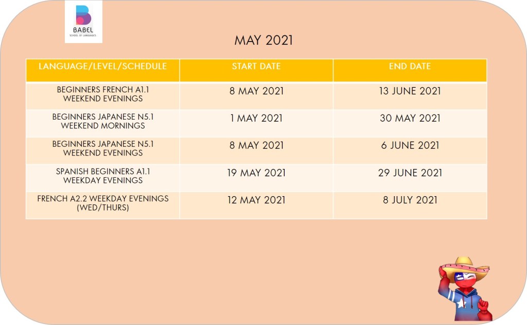 Just choose the language you are interested in from the Course Calendar menu to find out what’s currently on at Babel School of Languages.